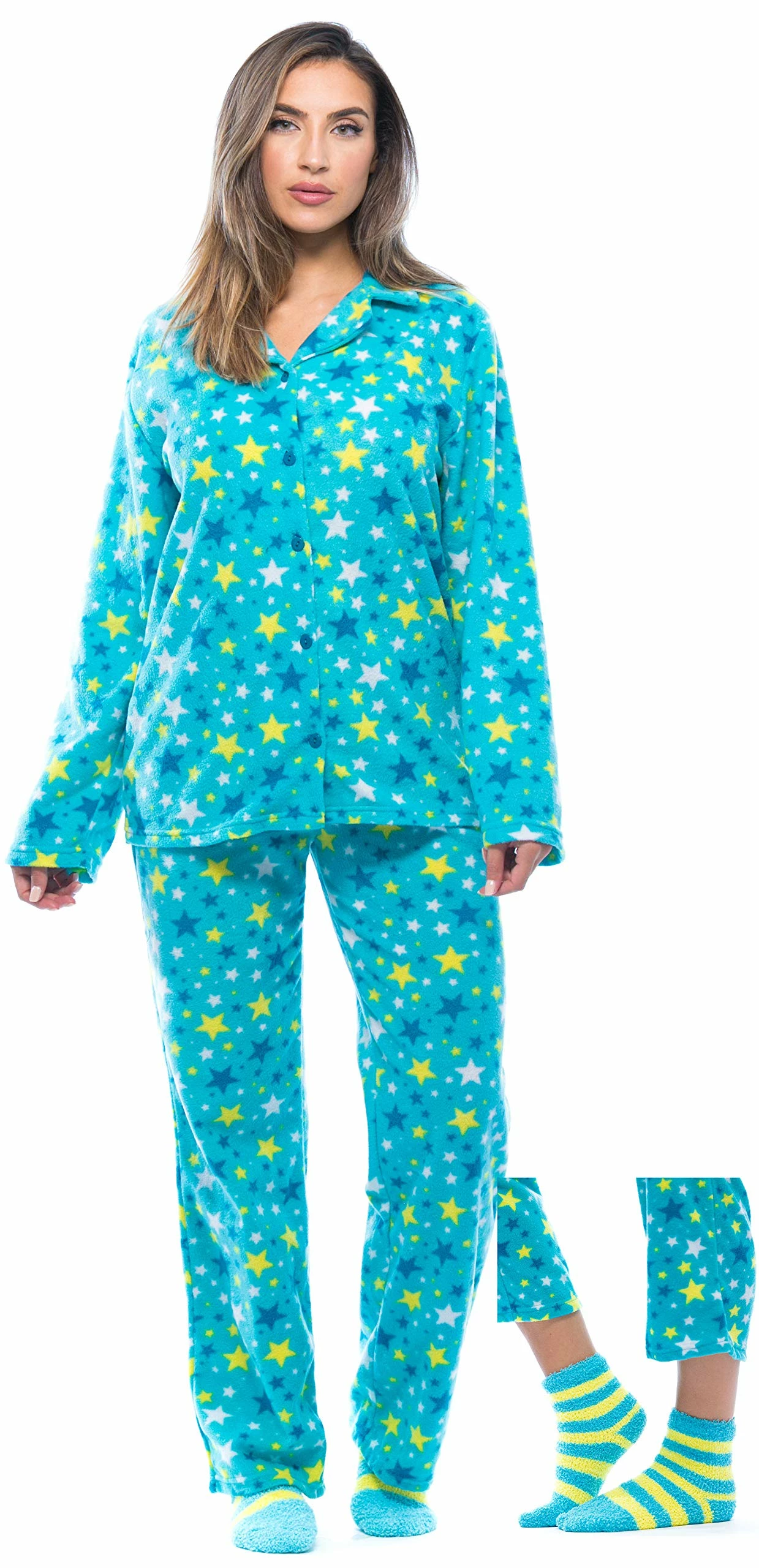 - OH SO COZY: Keep comfortable warm whenever the cold weather creeps in with the #followme super soft 3-piece microfleece pajama set for women. It comes with a comfy button front top, matching pajama bottoms, and a pair of warm fuzzy socks all made using non-irritating 100% polyester microfleece.