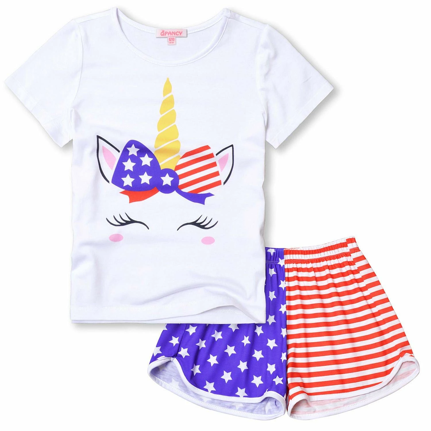 - Girls USA flag Unicorn face pajama sets, short sleeves, crew neck, sleep set includes sleep tee and matching sleep bottoms