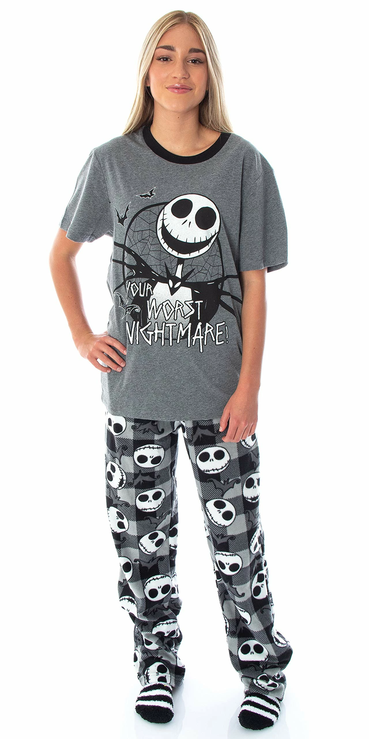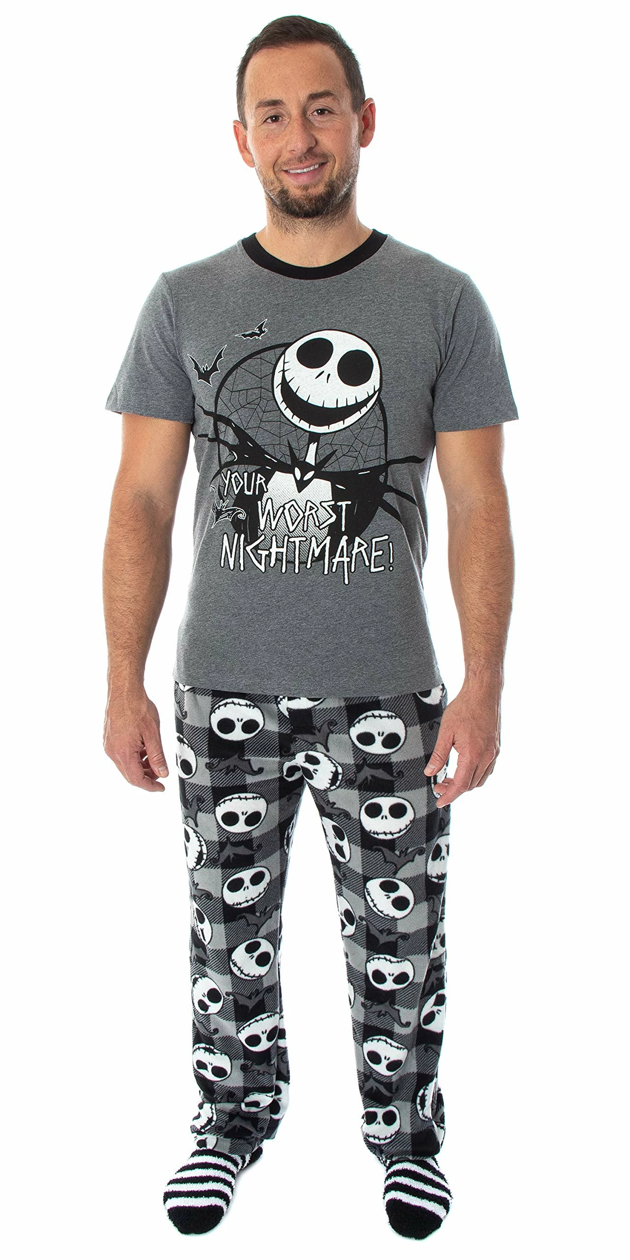 - 3-PIECE PAJAMA SET THAT IS PERFECT FOR THE HOLIDAYS! – There is nothing like putting on a new pair of pajamas and lounging around watching your favorite films or reading your favorite books! This Nightmare Before Christmas Pajama Set makes a delightful gift for you or someone you know this holiday! Material is Top: 60% Cotton/40% Polyester Pants: 100% Polyester Microfleece Socks: 99% Polyester/1% Spandex