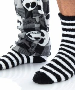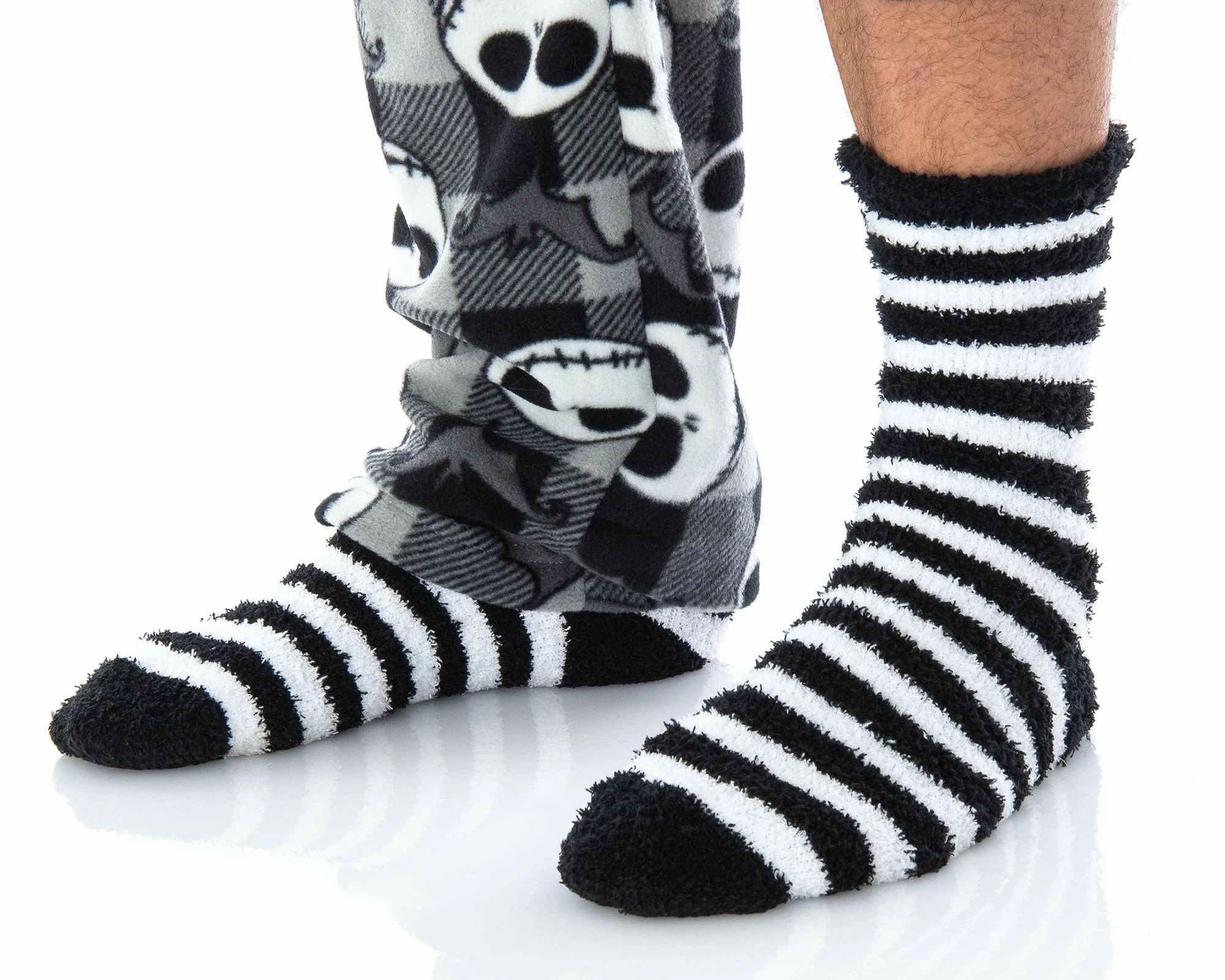 - SUPER-SOFT FLEECE PANTS AND COZY SOCKS – The pants feature an allover design of Jack’s heads and bats on a checkered pattern. The socks are of a cozy polyester/spandex fabric, thick and comfy with a black and white stripe pattern!