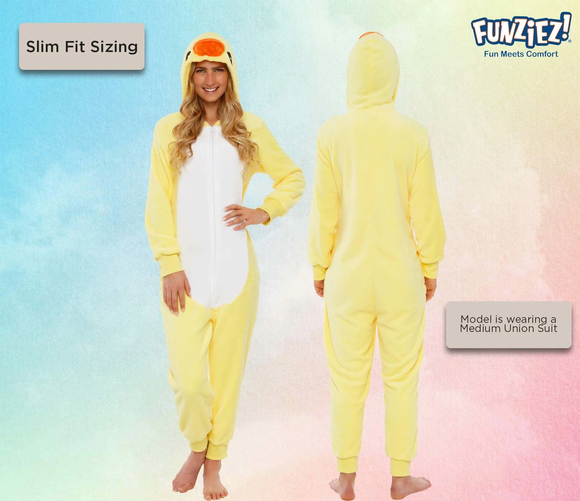 Look adorable while you relax in these Slim Fit Duck One Piece Pajamas by Silver Lilly! Crafted from ultra-soft 100% polyester, this comfy bodysuit pairs fun animal designs with a sleek silhouette, for a cozy costume that’s perfect for play. Intricate detailing on the head and body bring this adorable character to life, with stitched in eyes and plush beak for added effect. Two side pockets are convenient for storing your phone, wallet or other must- haves, and zip closed so nothing gets lost. The slim fit design provides the same amount of coverage and warmth without restricting movement, so you can sleep, dance or play as you please. The zip front closure makes getting dressed a breeze, and stays securely closed for comfort. Whether you wear it to bed or to the bar, you’ll love how these slim fit animal pajamas make you feel! For best results hand wash, lay flat to dry, and iron on low heat if needed. Multiple sizes available.