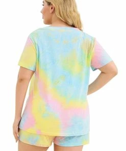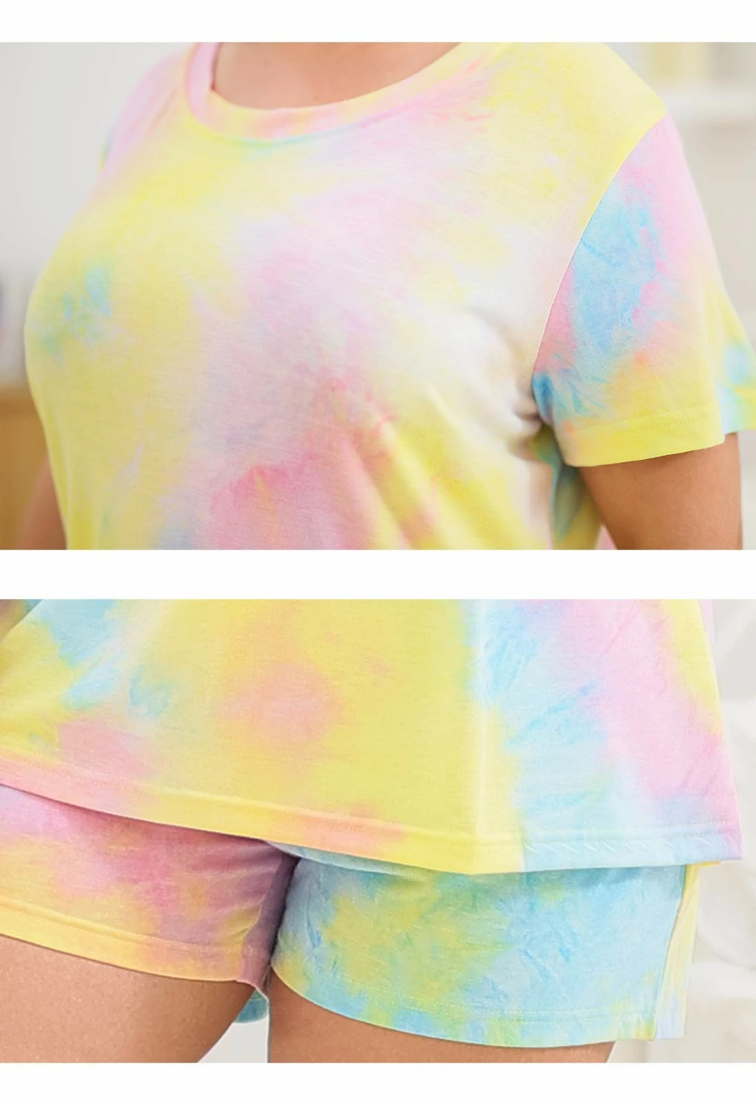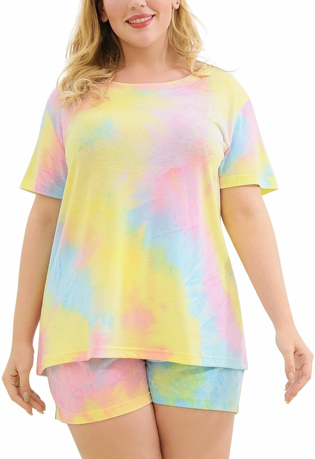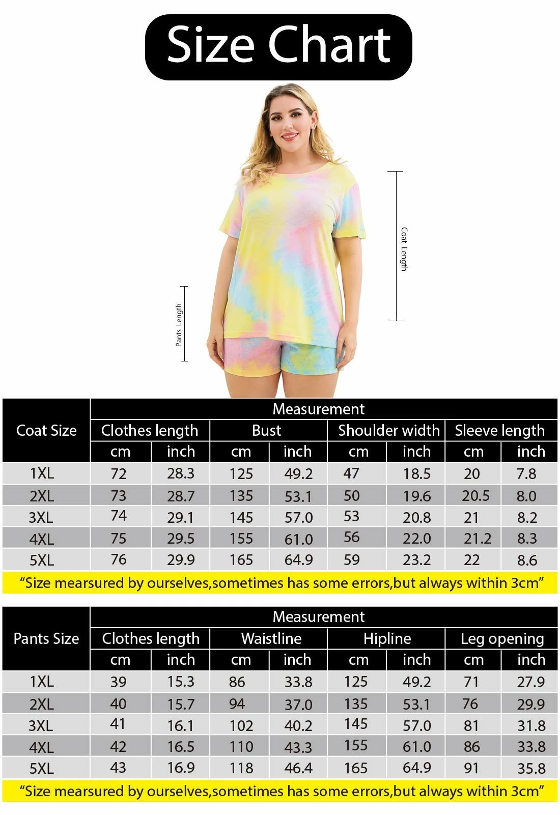 - Fashion tie dye printPlus size pajamas for women whit pocket,Features an adorable tie-dye, short sleeves, round neck, oversized, loose-fitting, elastic waist. Two piece casual big size set nightwear for women. New chic tie dye patterned that keeps you fashion all the time.