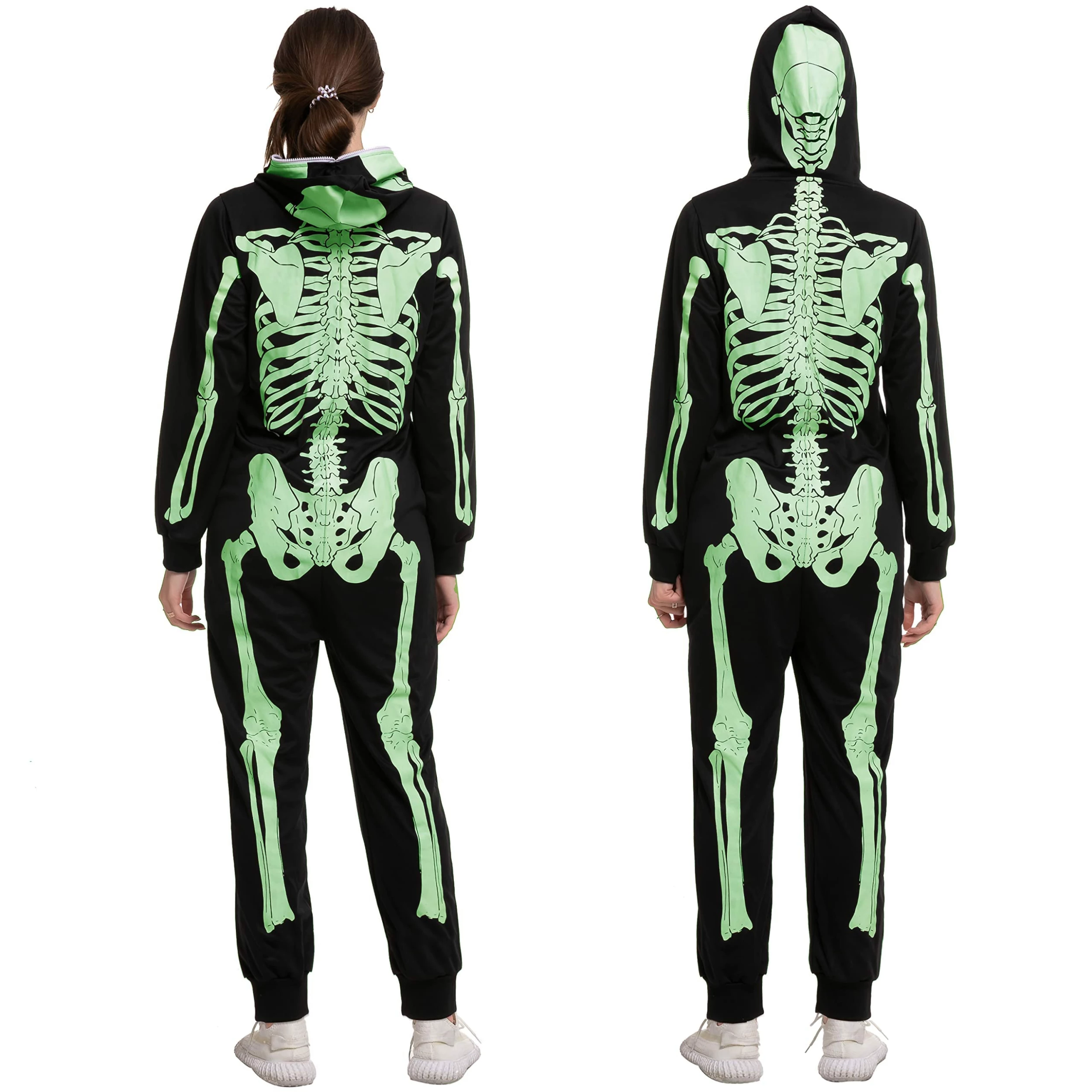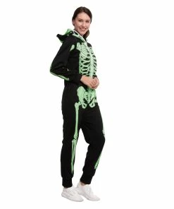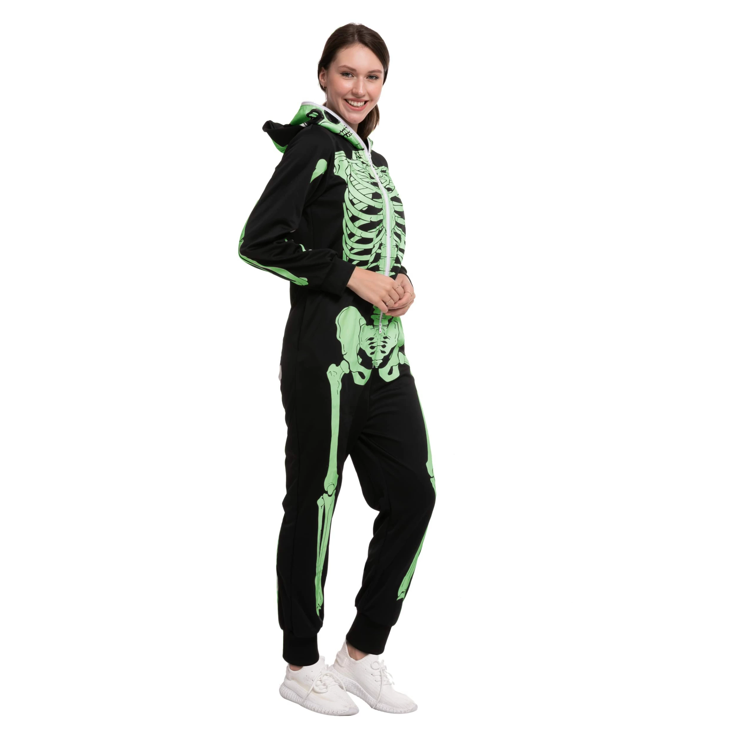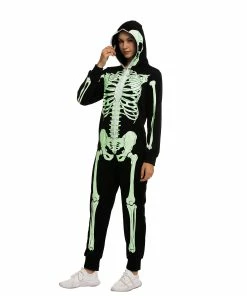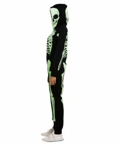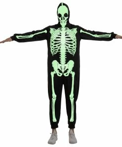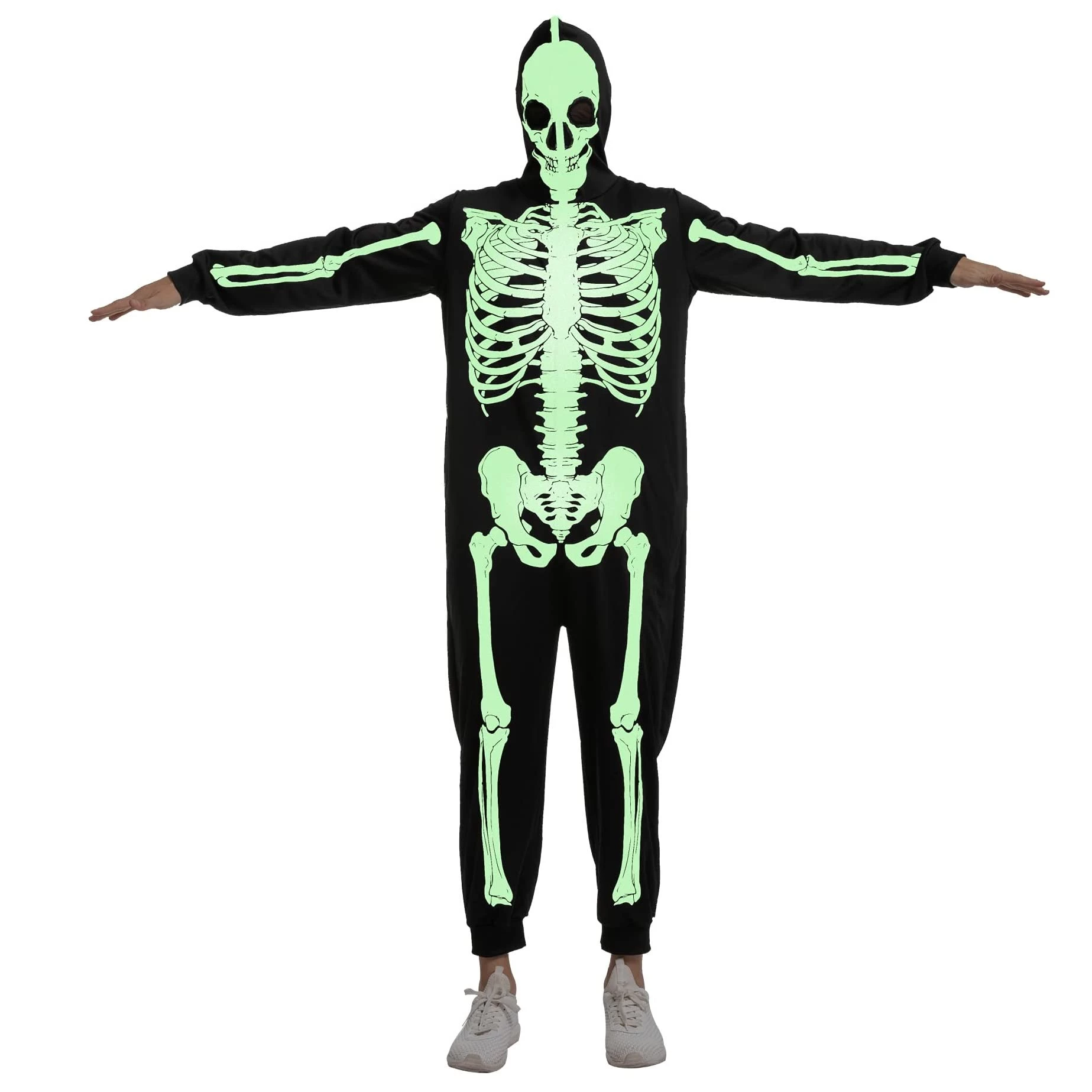 - Our Skeleton costume includes 1 piece of Glow in the Dark skeleton themed jumpsuit sleepwear pajamas. Features a glow in the dark printed skeleton on the front and the back of the costume and a zipper that goes over the head. Easily wear the costume and get undressed.