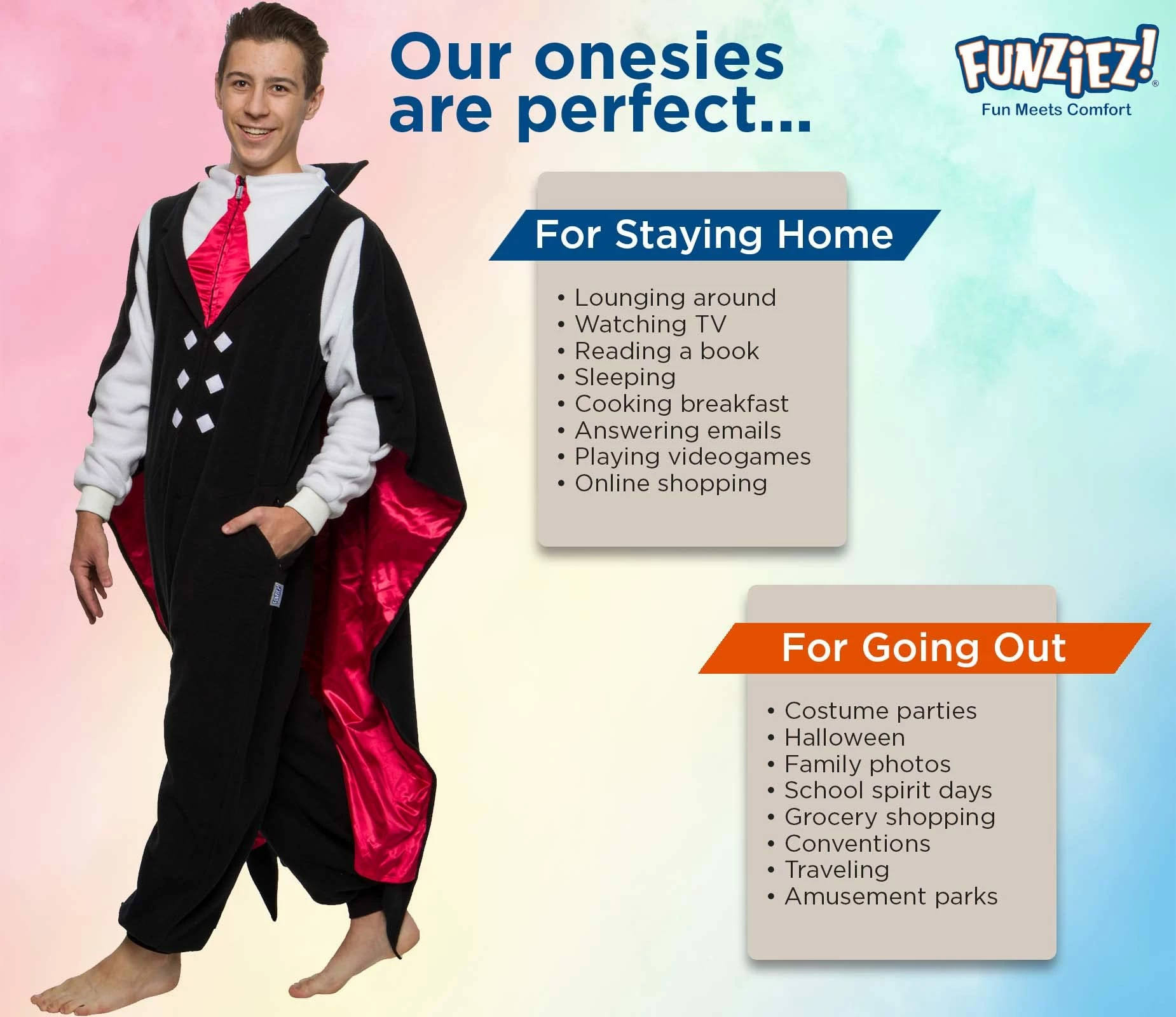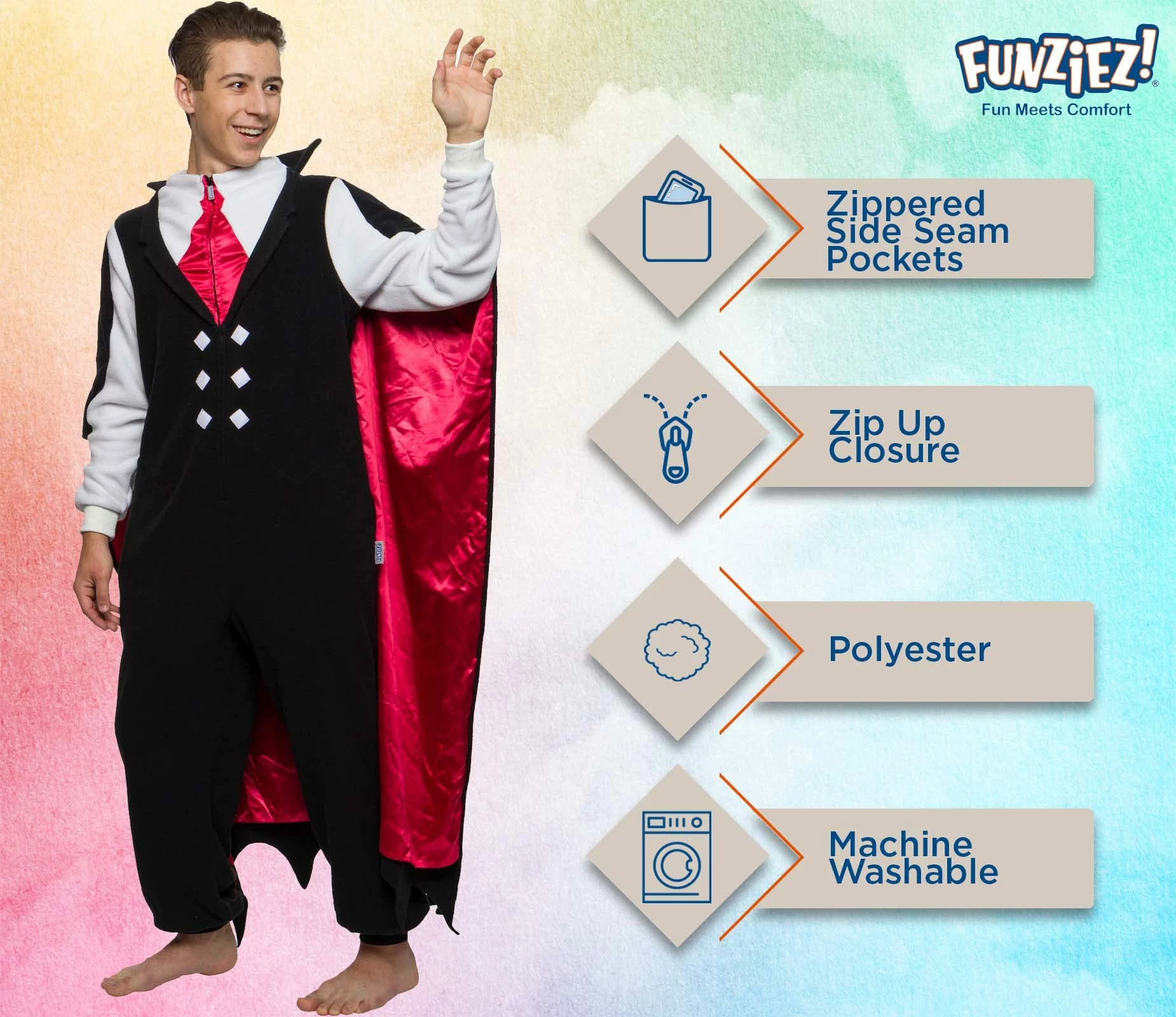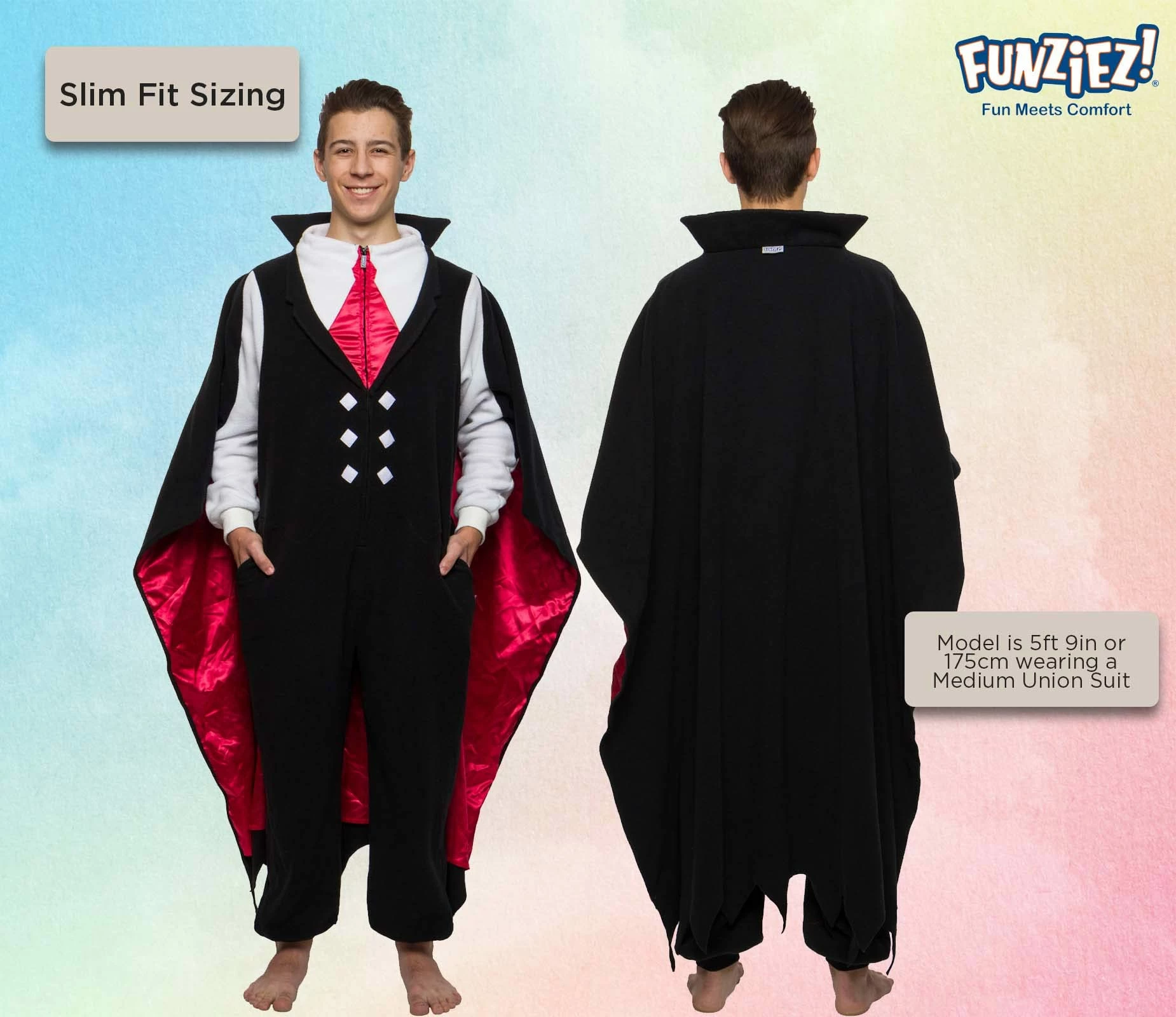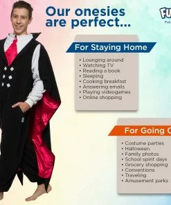 Read more Why does Dracula not have friends? He’s such a pain in the neck Special Features Faux vest and tie look with attached collared cape Hobbies Include Drinking blood and avoiding sunlight Did you know that in Greek mythology, hydra dragons are one of the most notorious, uniquely dangerous and difficult to defeat? Scroll through our other Funziez to see more fun facts about animals, food, and more! The “Hobbies Include” sections also happen to be interesting factoids about your favorites. Check out our storefront and hit the “Follow” button to see more π FUNZIEZ! costumes are all in the details Available in adult sizes X-Small through X-Large An ideal blend of comfort and fun in a relaxed fit Perfect for any occasion, especially Halloween Read more Read more Ghost One Piece Novelty Union Suit Jack O Lantern One Piece Novelty Union Suit Skeleton One Piece Novelty Union Suit Dinosaur Slim Fit One Piece Novelty Union Suit Spider One Piece Novelty Union Suit Devil One Piece Novelty Union Suit Special Features Ghost face and sheet ghost look for arms Jack o lantern face and pumpkin leaves and stem around hood Human bones design Scales along the back, tail, teeth Furry legs and pedipalps on hood Fiery prints by cuffs, horns on hood and tail Hobbies Include Haunting, whether friendly or scary, it’s hard to tell sometimes Being a fruit, producing about 500 seeds Having over 200 bones make up the human skeleton, with two types of bones Exploring and living all over the world Producing silk and eating more insects than both birds and bats Wreaking havoc, chaos and deception Standard Fit Sizing β β β Slim Fit Sizing β β β
