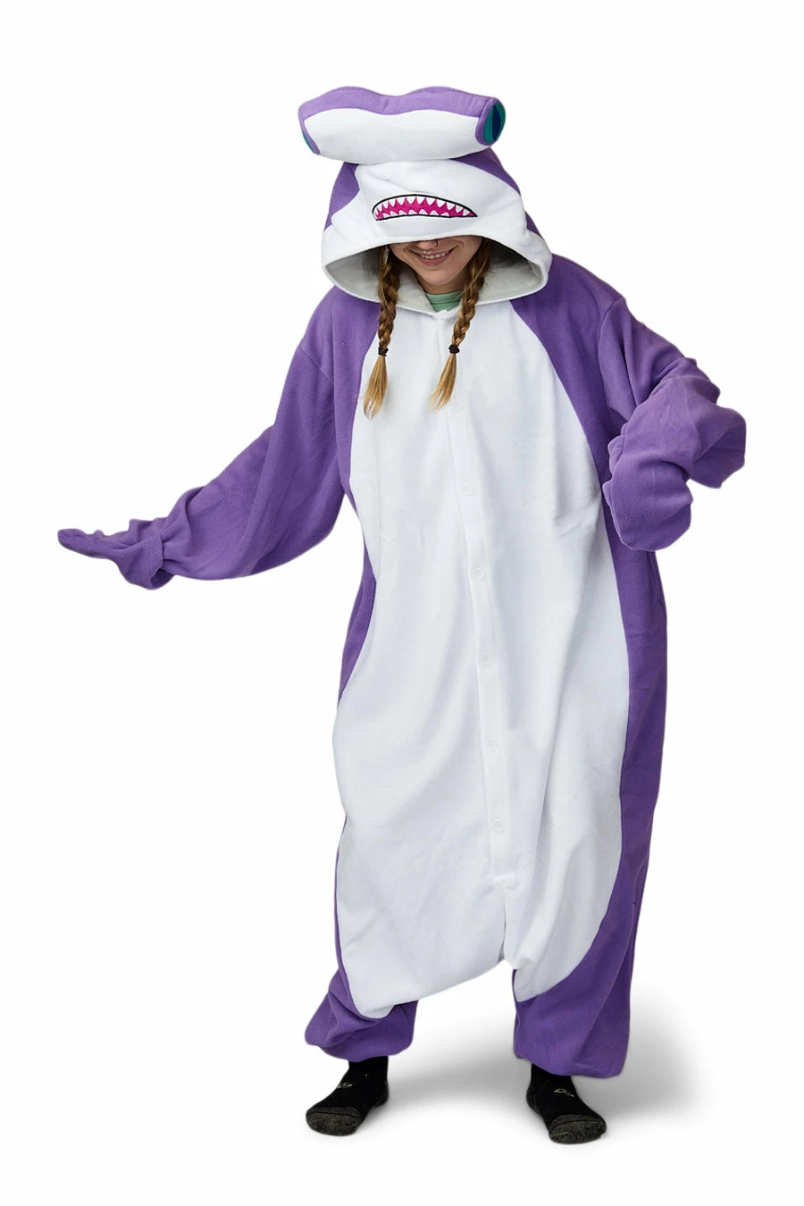 Enjoy standing out from the herd by donning your very own oh-so-comfortable Hammerhead Shark Kigurumi. Indeed, at your next fancy dress party, people will not be able to resist reaching out and feeling for themselves how fantastically soft and smooth this animal onesie is. You could choose to show everyone how nice of a shark you are, just like Anchor from Finding Nemo. Or, you could go on a mindless feeding frenzy and devour all of the snacks’ insight. Your choice.
