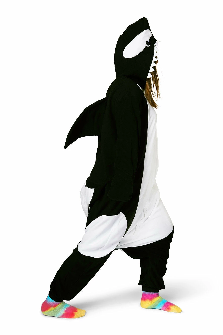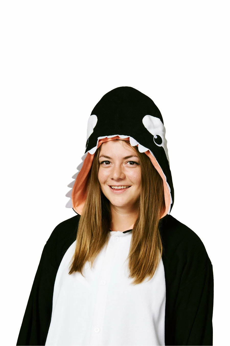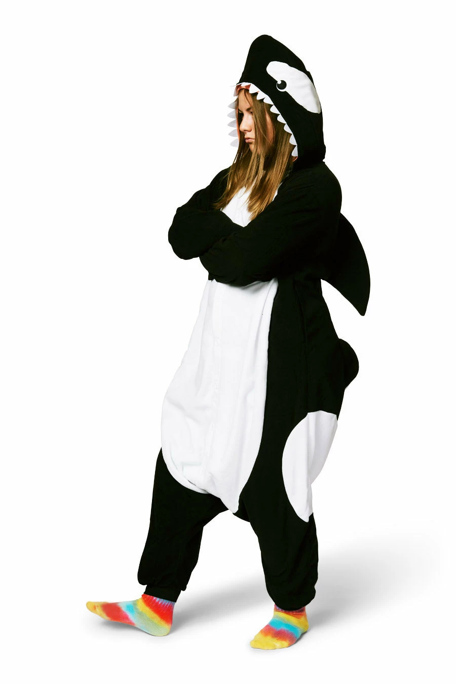 Well, now you do! Wearing this indulgently comfortable Killer Whale Kigurumi, with its flip-back flippers, dorsal fin, and teeth accents will place you at the top of the pecking order at your next costume party.