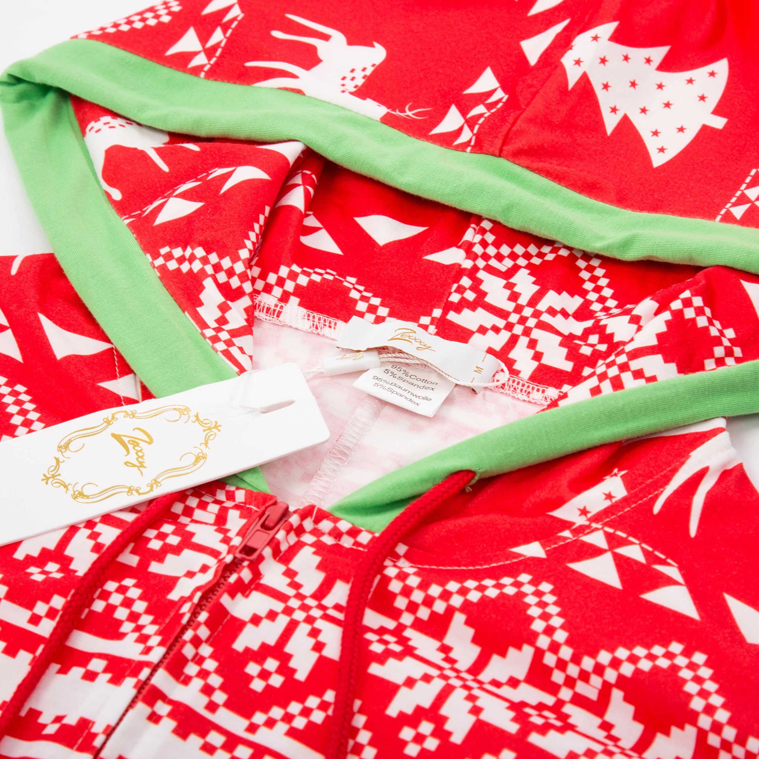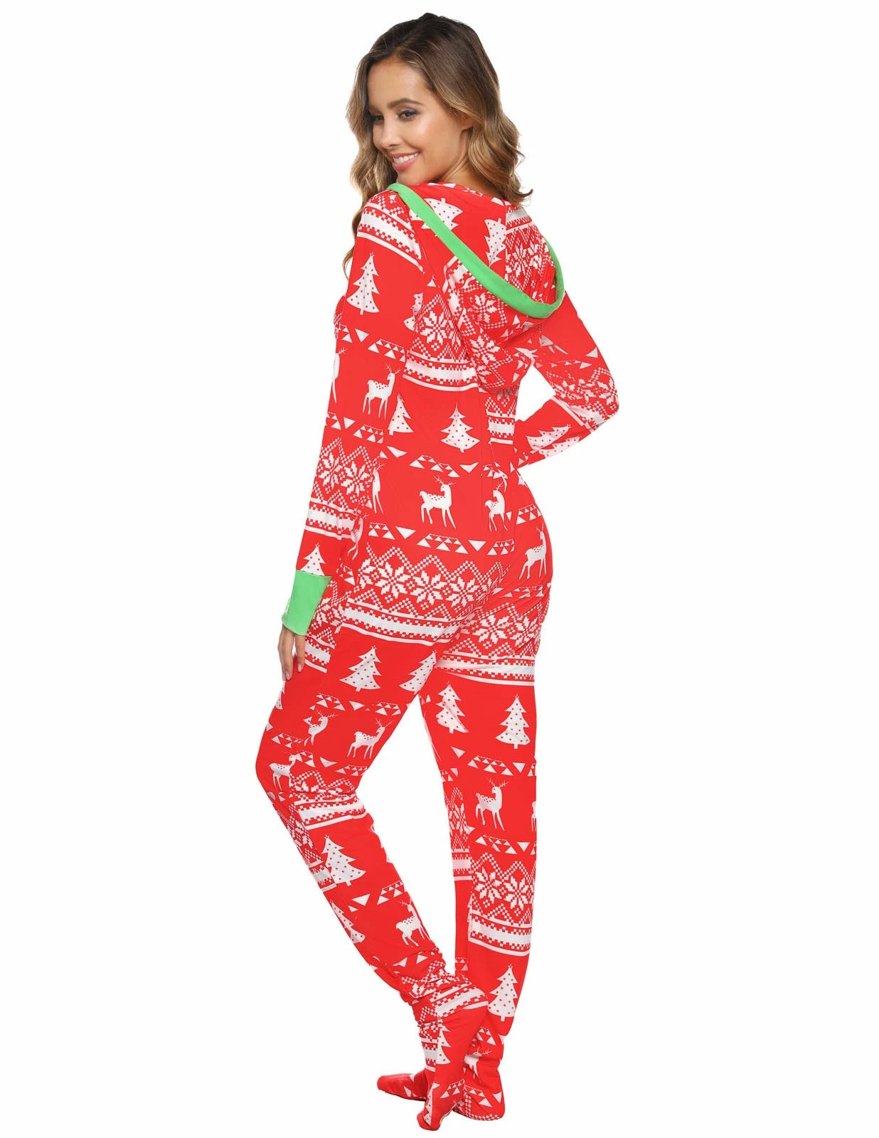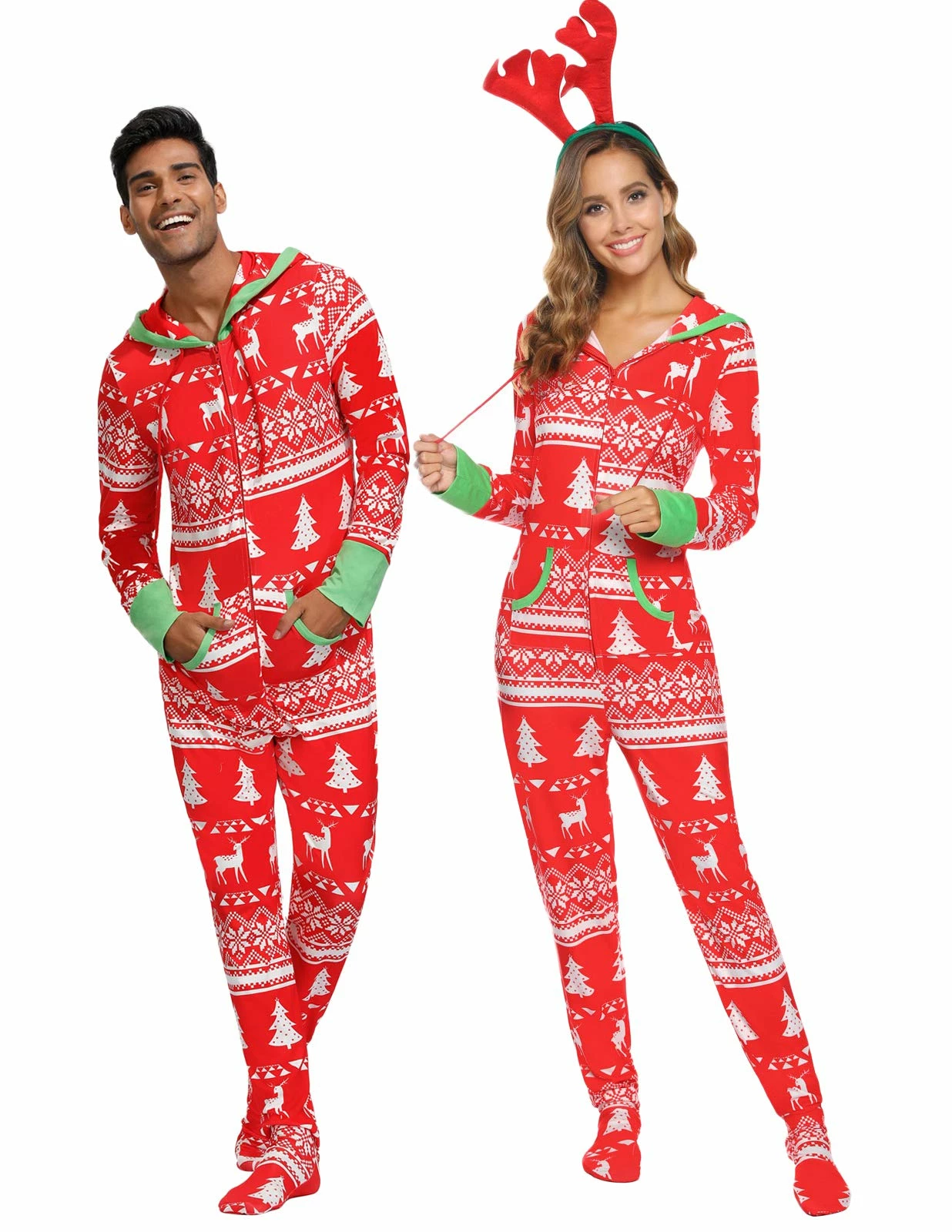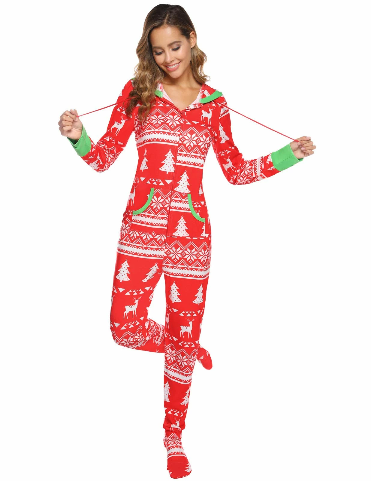 - HOOD PAJAMAS: Drawstring around hood, zipper in the front, two kangaroo pockets, footed design, novelty print, looking festive